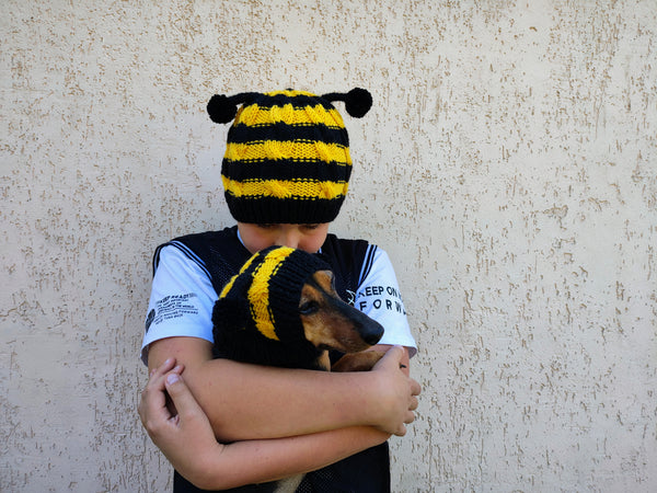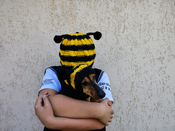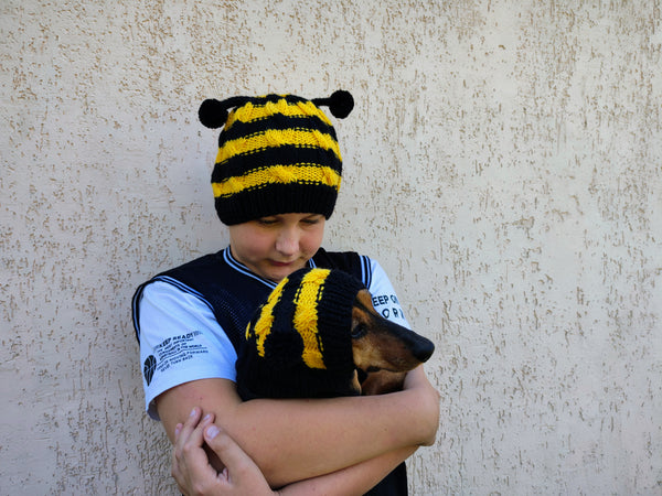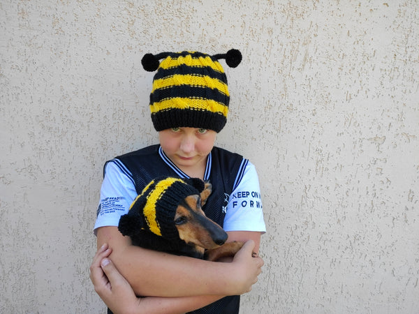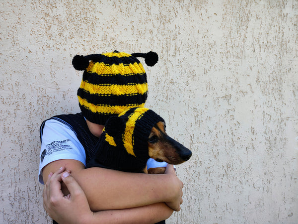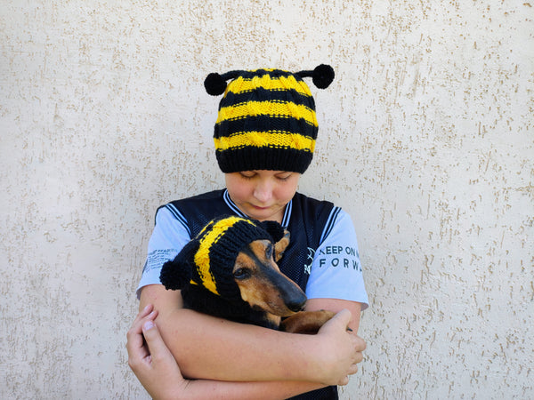 Set of hats with pom-pom for mom and dachshund, set of knitted hats with pom-pom for hostess and dog