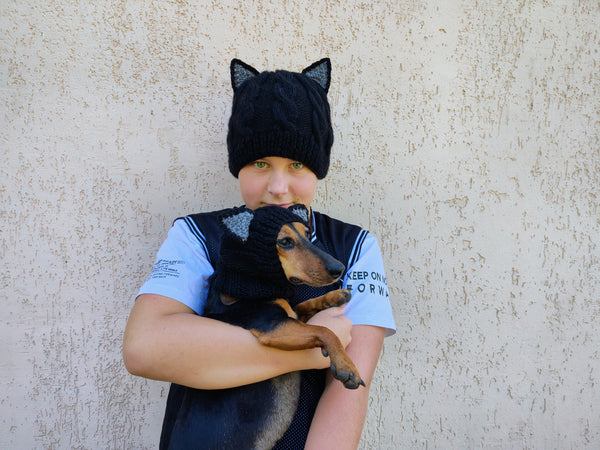 Set of hats with pom-pom for mom and dachshund, set of knitted hats with pom-pom for hostess and dog