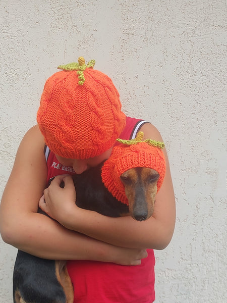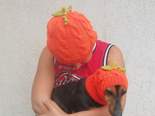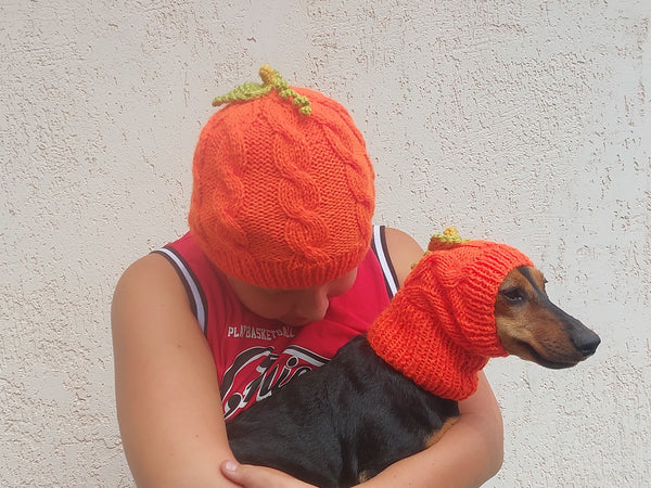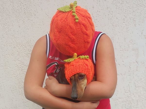 Set of hats with pom-pom for mom and dachshund, set of knitted hats with pom-pom for hostess and dog