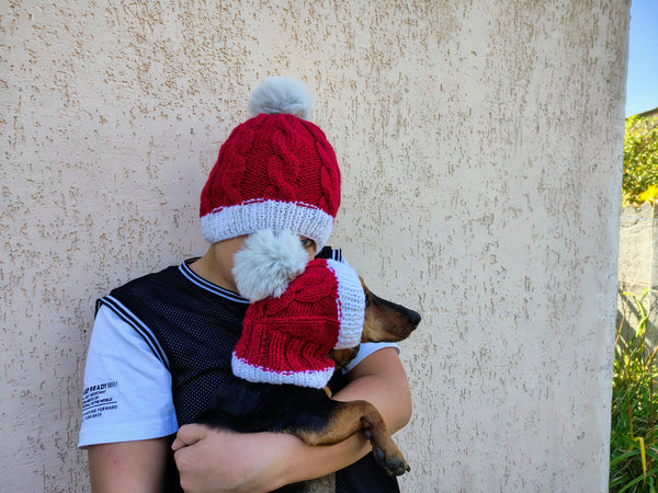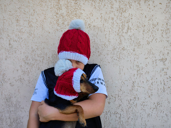 Set of hats with pom-pom for mom and dachshund, set of knitted hats with pom-pom for hostess and dog