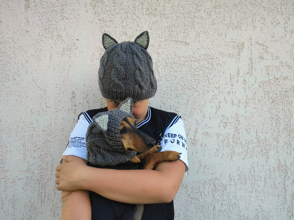 Set of hats with pom-pom for mom and dachshund, set of knitted hats with pom-pom for hostess and dog